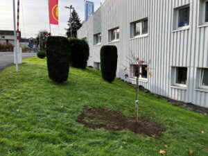 Gesagt, getan – und so steht nun ein neuer Baum im Einfahrtsbereich des Industrieparks, der ab sofort alle Mieterinnen, Mieter und Besucher herzlich begrüßt.